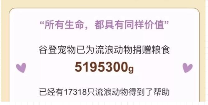 谷登GOLDEN自2018年6月1日倡导发起的“50g公益”活动,旨在长期帮助流浪动物。活动获得了百万人关注,数十万人次转发,十几万人次参与。截至目前,谷登已经向流浪动物捐赠519,530,0g公益宠粮,已有17318只流浪动物得到了帮助。